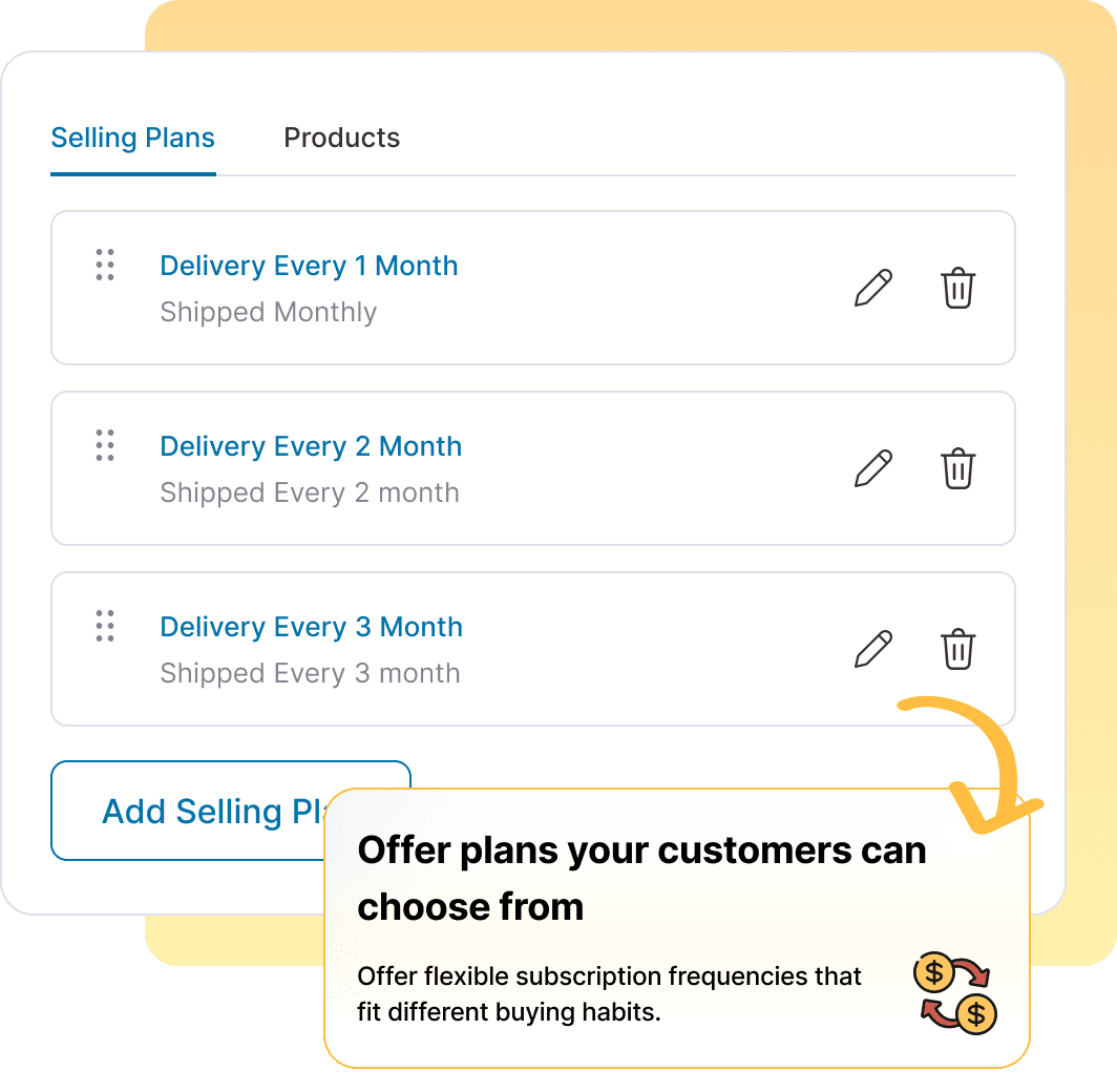 Perfect for “Subscribe & Save” consumables or curated monthly boxes. Let customers auto-replenish coffee, vitamins, or pet food on a set schedule.