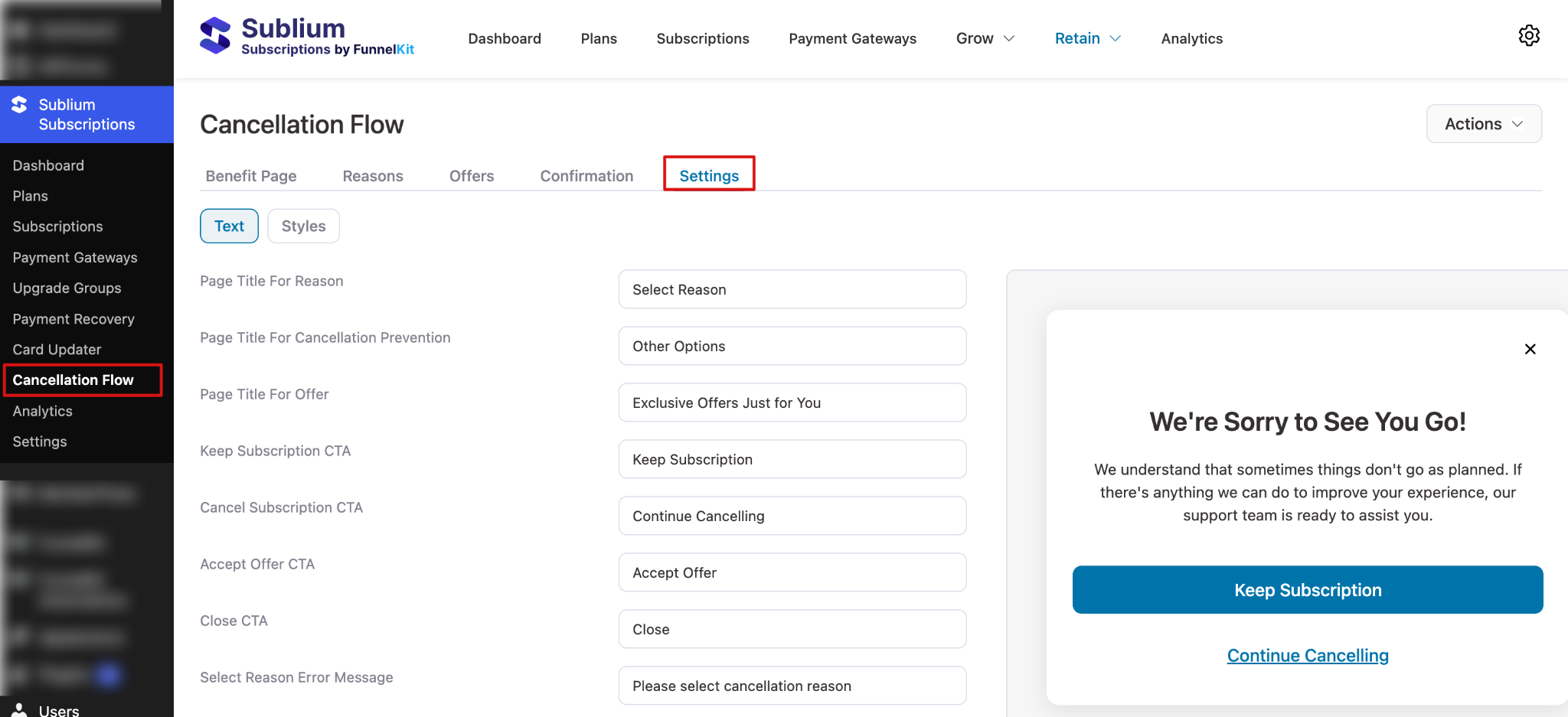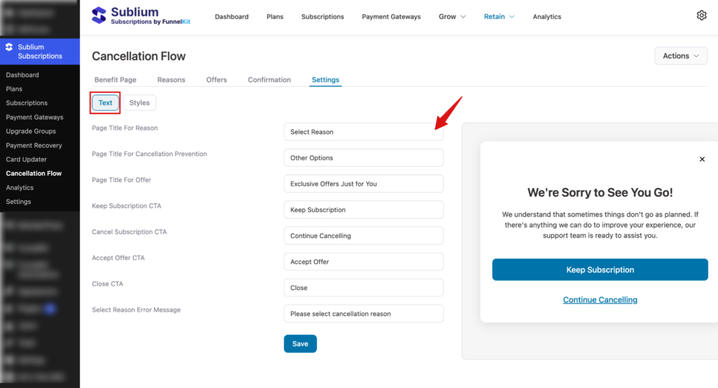 To access, navigate to Sublium Subscriptions ⇒ Cancellation Flow ⇒Settings.