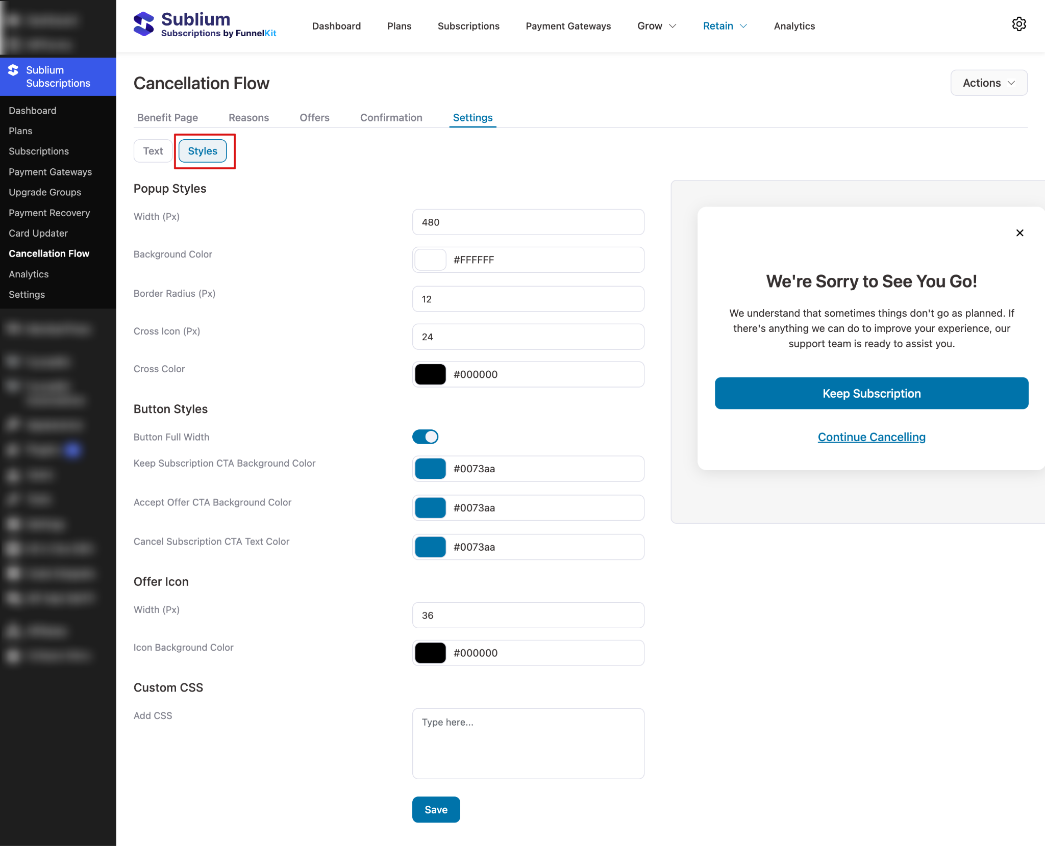 This page allows you to set up texts and styles for the cancellation pop-up in Sublium Subscriptions.