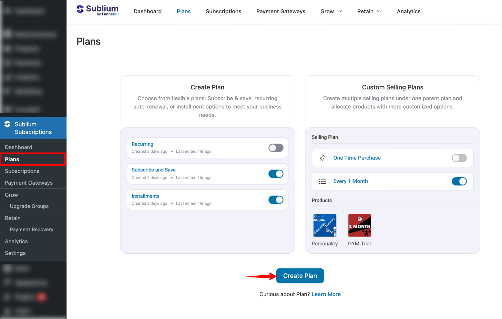 Go to your WordPress Dashboard and navigate to Sublium Subscriptions ⇒ Plans.