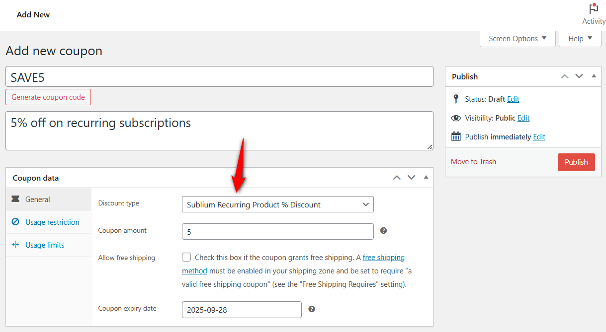 You can configure subscription coupon settings, such as usage restrictions and limits, too. Once done, hit the Publish button.