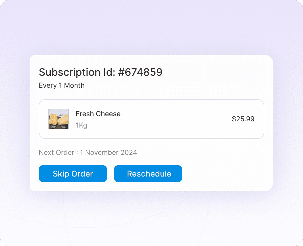Give subscribers full control. Let them pause, swap, or cancel subscription plans, update billing, and manage deliveries instantly, which boosts trust and retention.